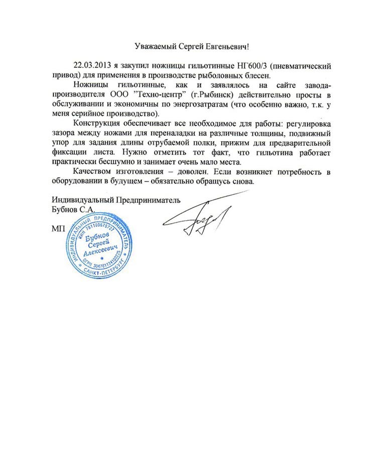 22.03.2013 я закупил ножницы гильотинные НГ600/3 (пневматический привод) для применения в производстве рыболовных блесен. Ножницы гильотинные, как и заявлялось на сайте завода-производителя ООО «Техно-центр» (г. Рыбинск) действительно просты в обслуживании и экономичны по энергозатратам (что особенно важно, т.к. у меня серийное производство).