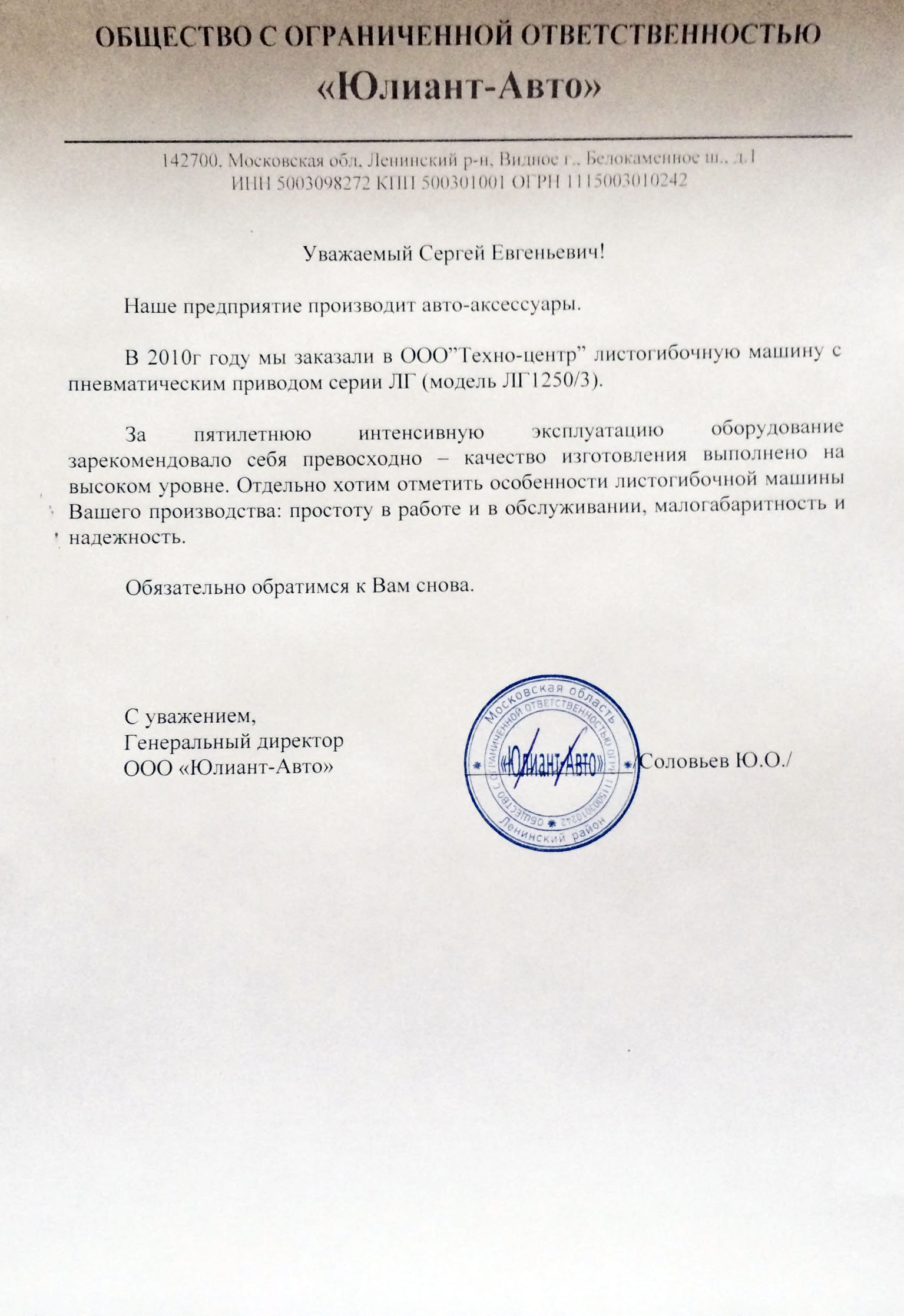 За пятилетнюю интенсивную эксплуатацию оборудование зарекомендовало себя превосходно - качество изготовления выполнено на высоком уровне. Отдельно хотим отметить особенности листогибочной машины Вашего производства: простоту в обслуживании, малогабаритность и надежность.