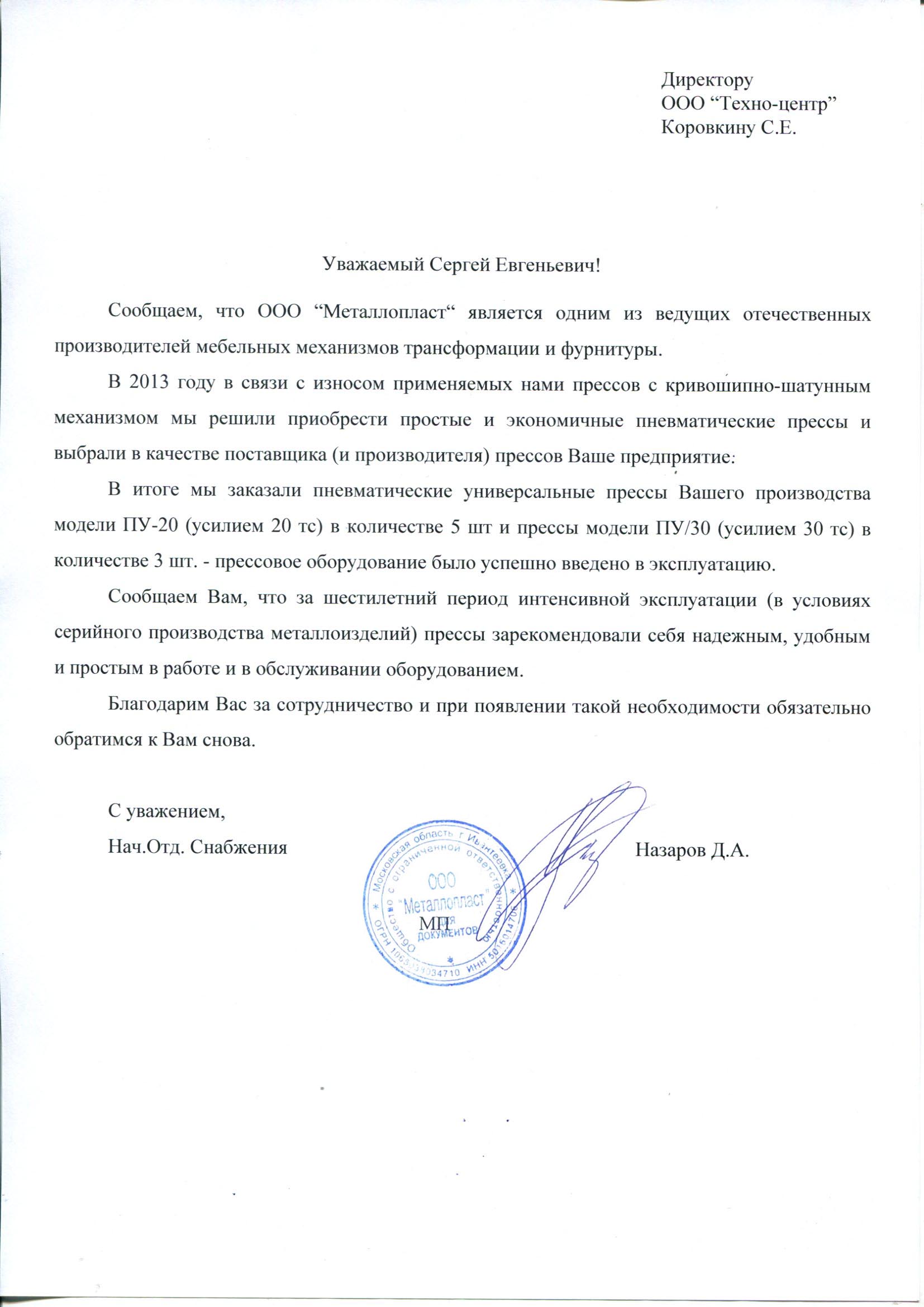 Сообщаем Вам, что за шестилетний период интенсивной эксплуатации (в условиях серийного производства металлоизделий) прессы зарекомендовали себя надежным, удобным и простым в работе и в обслуживании оборудованием. Благодарим Вас за сотрудничество и при появлении такой необходимости обязательно обратимся к Вам снова.