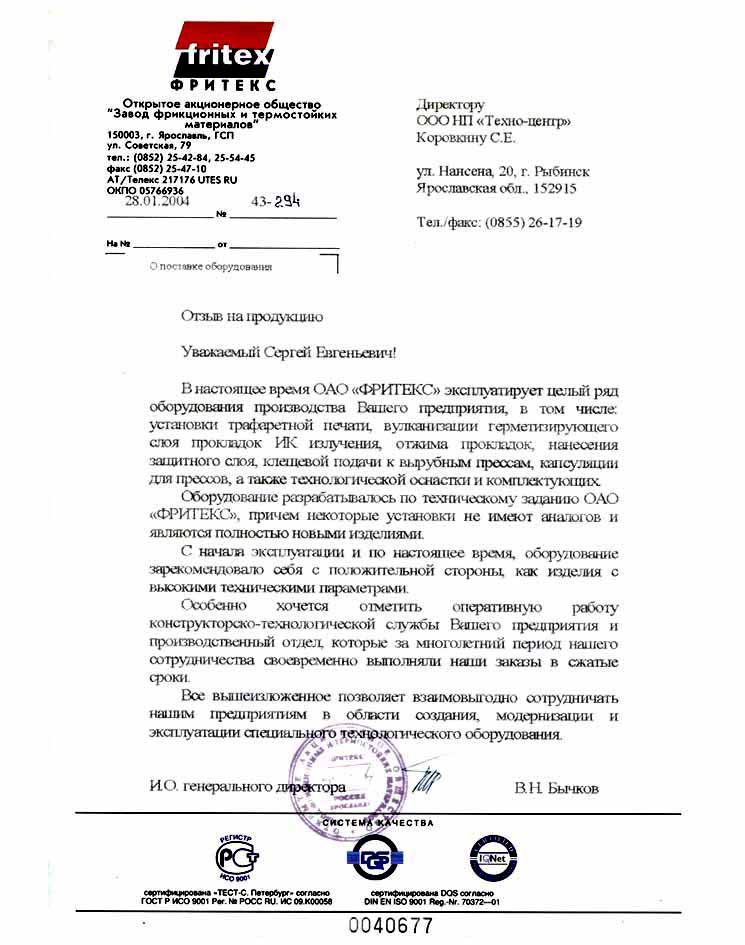 В настоящее время ОАО «ФРИТЕКС» эксплуатирует целый ряд оборудования производства вашего предприятия, в том числе: установки трафаретной печати, вулканизации герметизирующего слоя прокладок ИК излучения, отжима прокладок, нанесения защитного слоя, клещевой подачи к вырубным прессам, капсуляции для прессов, а также технологической оснастки и комплектующих.