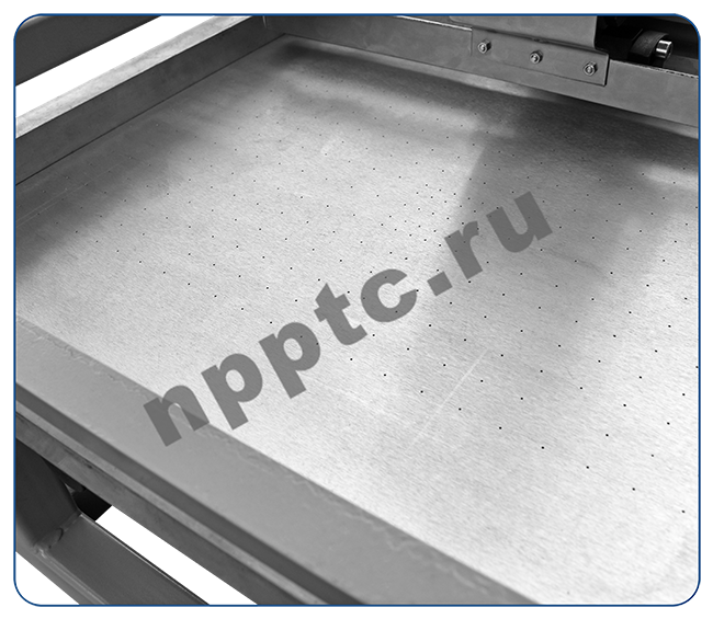 - Превосходная повторяемость и высокое качество нанесения пасты, достигаются за счет возможности регулировки величины давления ракеля и поддержания этого значения постоянным в процессе всего цикла нанесения, а также за счёт применения специальных фиксаторов и плавающего крепления ракеля.