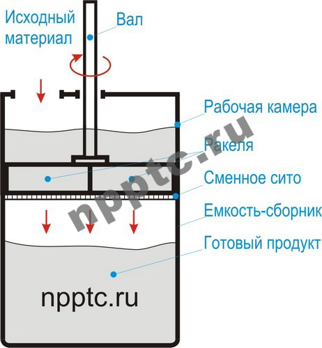 Исходный материал загружается в рабочую камеру, дном которой является сменное сито. Внутри рабочей камеры установлен протирочный вал с закрепленными на нем ракелями (полиуретановыми пластинами), которые плотно прилегают к ситу. При вращении вала выполняется механический протир материала через сито. Готовый продукт падает в установленный под рабочей камерой емкость-сборник.