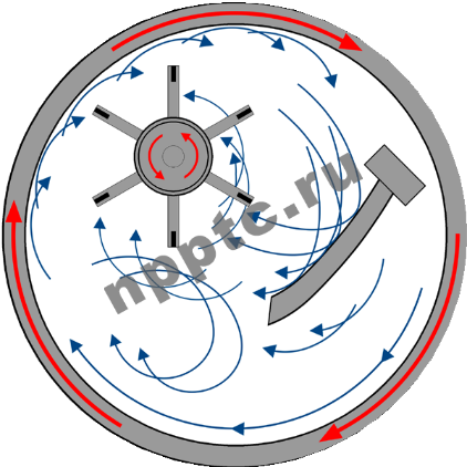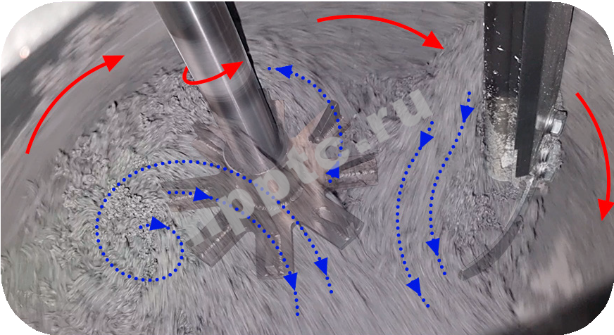 - Благодаря подобранным параметрам движения смешивающих устройств и смесительной емкости, обеспечивается интенсивное смешивание и сдвиг обрабатываемого состава. Разнонаправленное движение смеси по всему объему перемешиваемого состава исключает образование застойных зон.