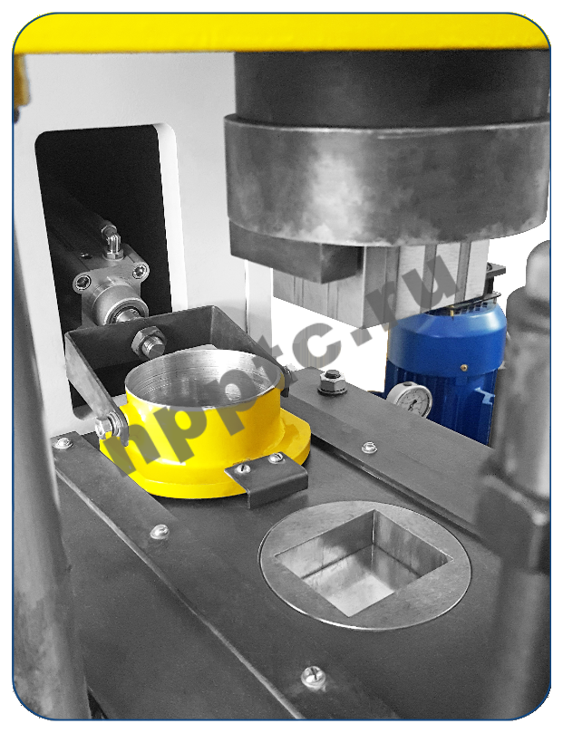 Для засыпки гранулированного порошка в пресс-форму пресс оснащен двумя накопительными бункерами с вибровстряхиванием, соединенными прозрачными гофрированными шлангами с одним / двумя питателями, размещенными в рабочей зоне (привод питателей – пневматический). Процесс прессования задается оператором с сенсорной панели – интерфейс понятен и удобен для оператора.