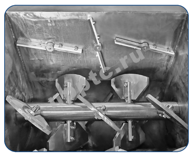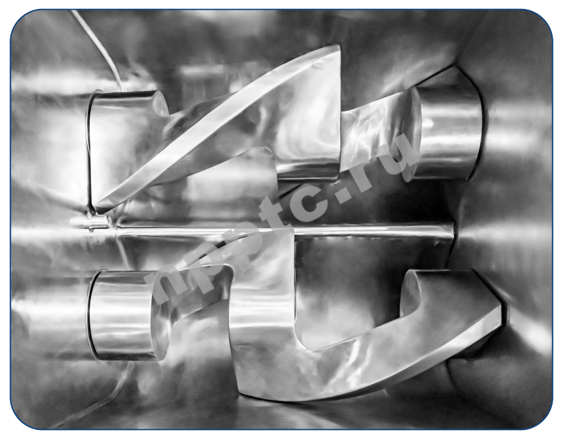 - Все внутренние поверхности хорошо отполированы – это обеспечивает удобство очистки, технического обслуживания, а также минимальную адгезию смешиваемого материала к лопастям и стенкам смесителя.