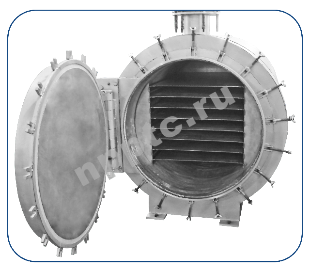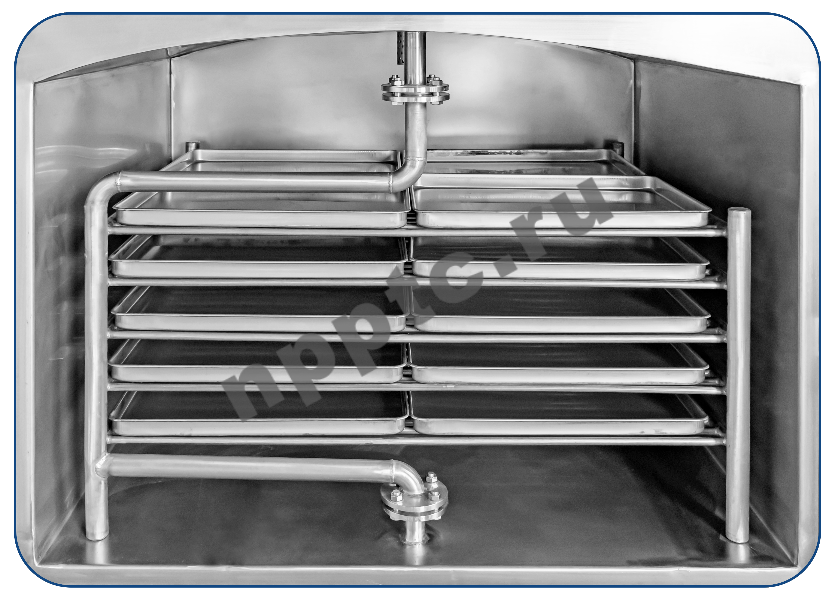 - Внутри вакуумной камеры находятся полки для материала, что позволяет с легкостью загружать и выгружать материал.